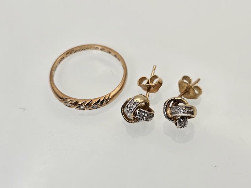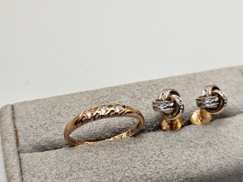 #1481 - 14k kultainen sormus ja korvakorut timanteilla, 3,22g