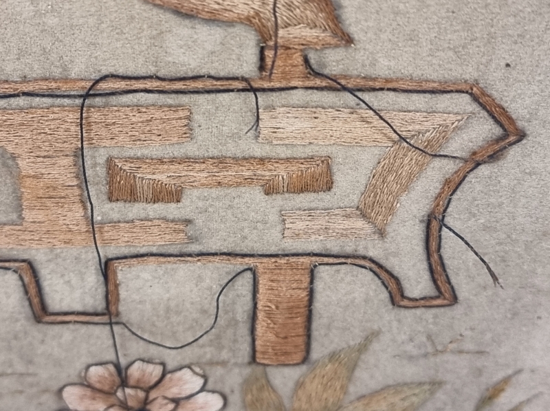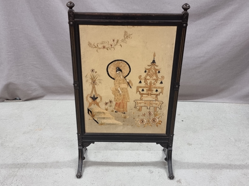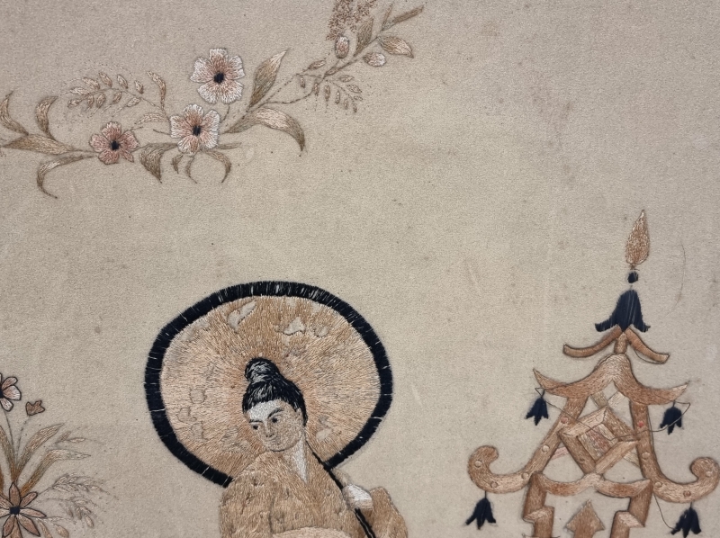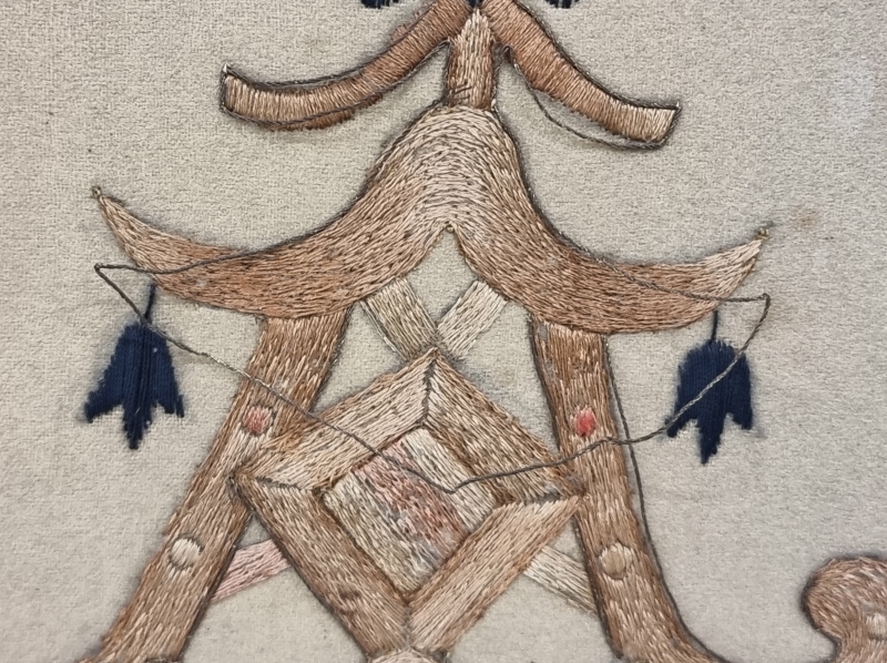 Itämaisilla koristeilla. Lankoja poikki. Yhdestä puukoristeesta puuttuu palanen.L: 62cm k: 104cm