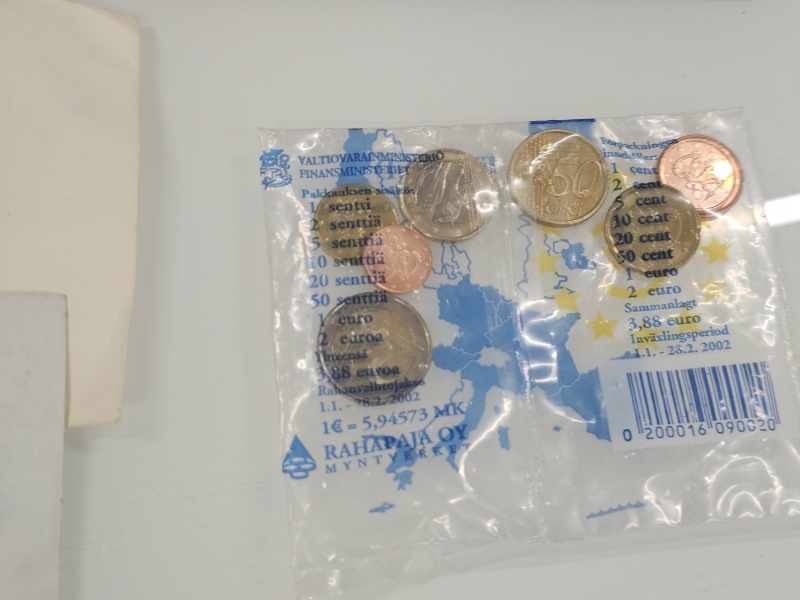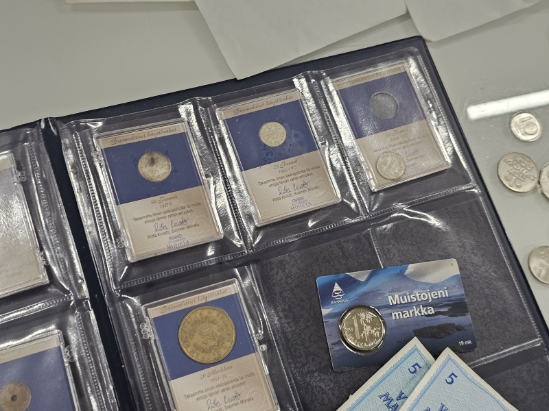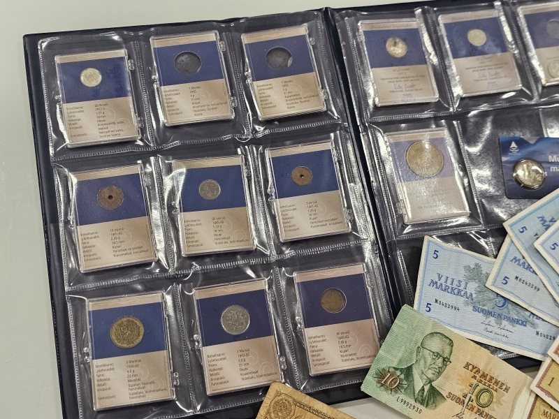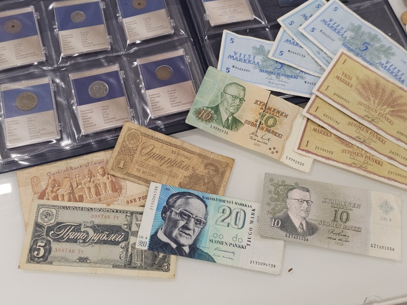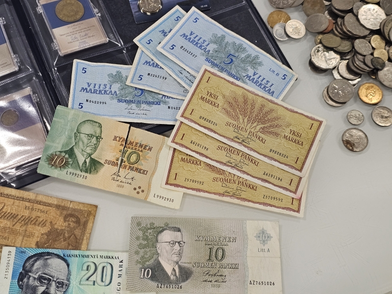 #1558 Iso erä keräilyseteleitä, kolikoita ja vanhoja rahoja eri maista