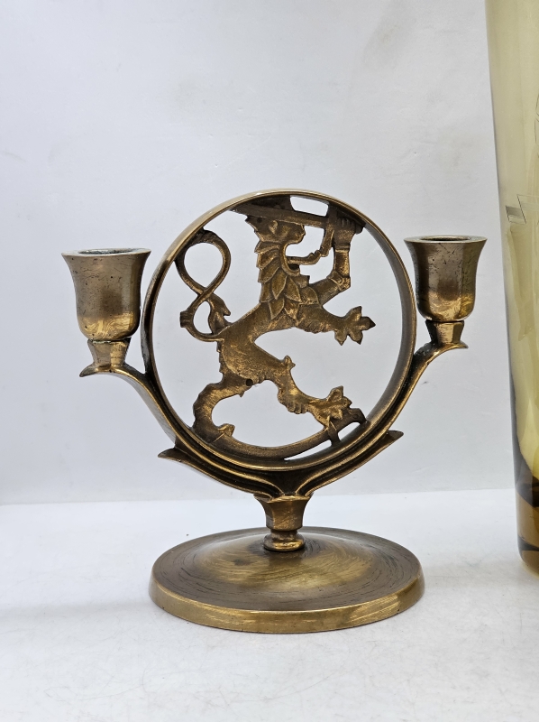 #1708 Sulo Tommola Kumela -maljakko Suomi-leijonalla & messinkinen kynttilänjalka
