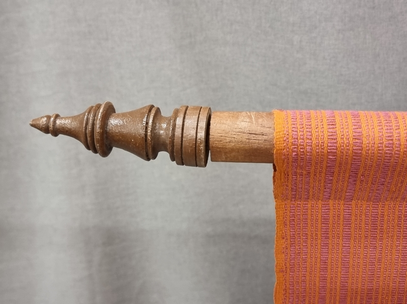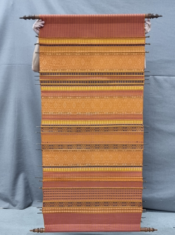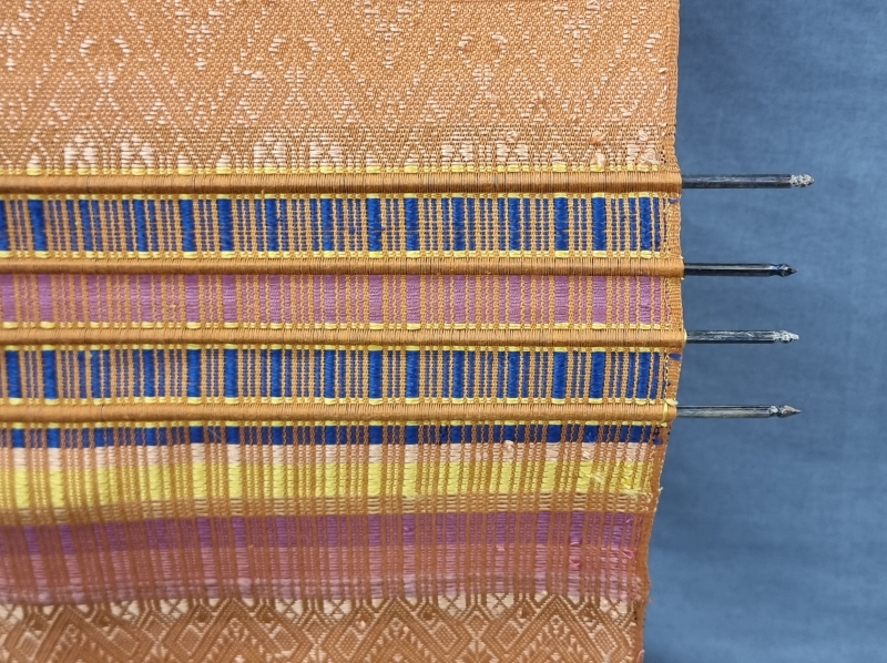 Käsityönä valmistettu. Silkkiä ja puuvillaa. Vaatteen valmistusprosessi kesti n. 2 vuotta. Leveys: 76cm korkeus: 175cm. Tukipuun leveys 106cm