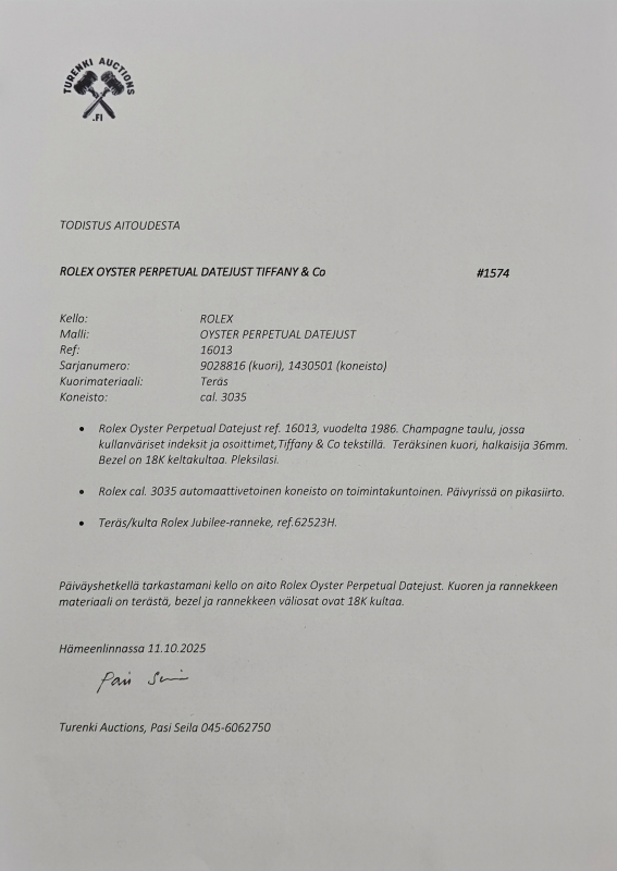 Mukana Tiffany -laatikko ja aitoustodistus. Halkaisija 35mm. Ref: 16013