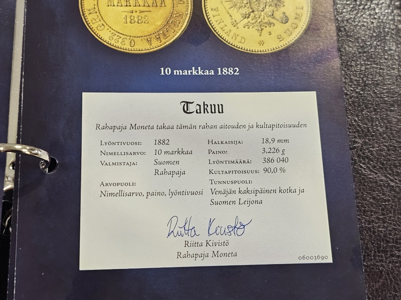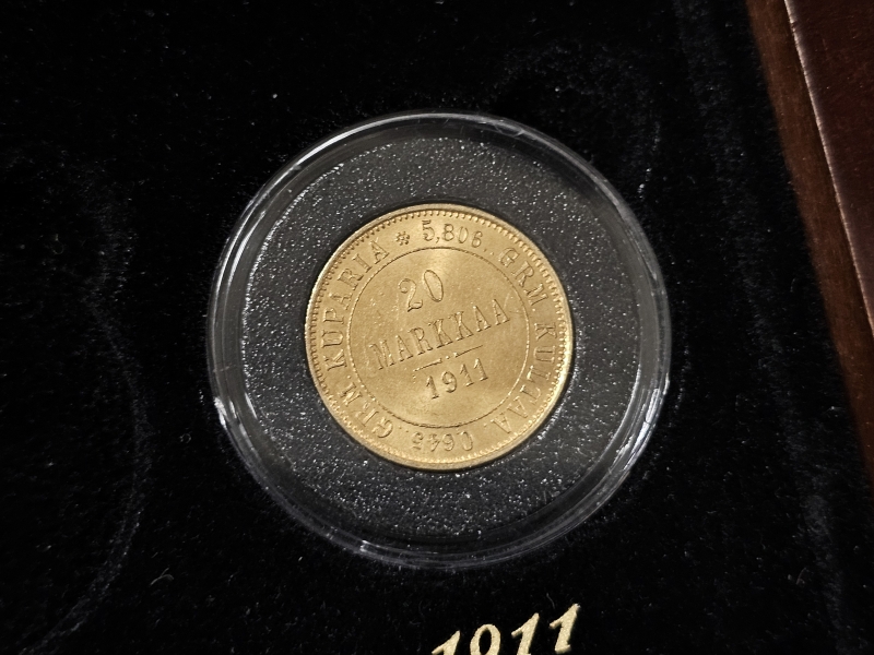 Paino 3,23g + 6,45g. Mukana Suomen ensimmäiset kultamarkat -keräilylaatikko ja paperit. Pitoisuus 900/1000