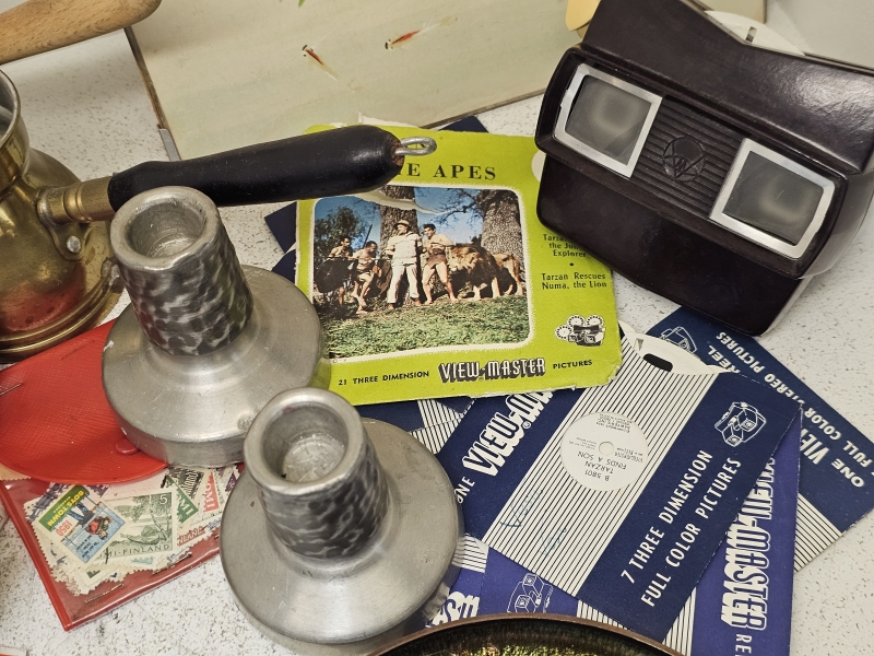 #2475 - Erä keräilytavaraa: Mm. postimerkkejä, cloisonnea, Viewmaster ja kuvia, Aarikka ym.