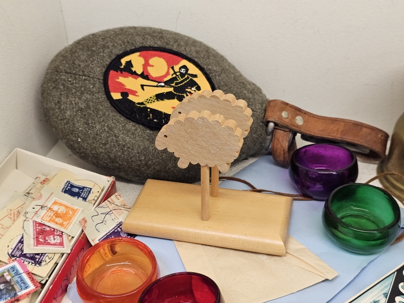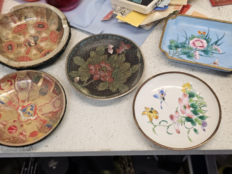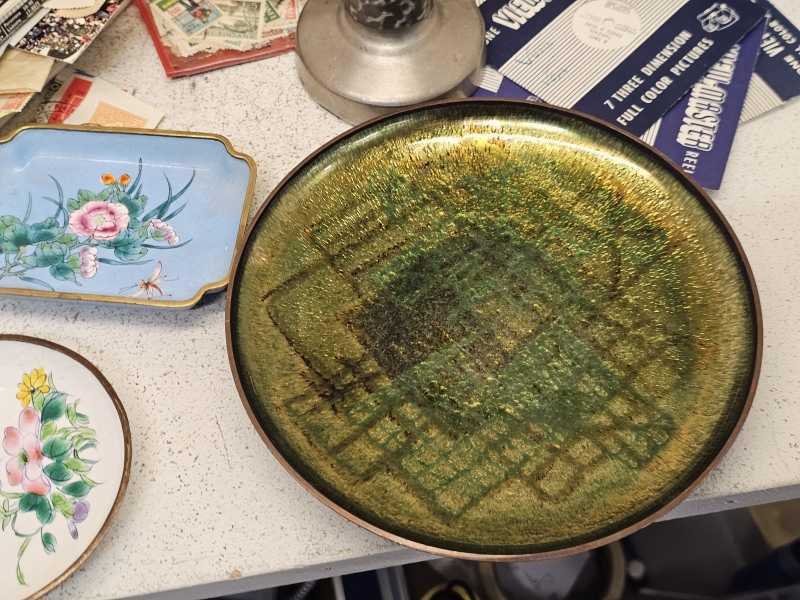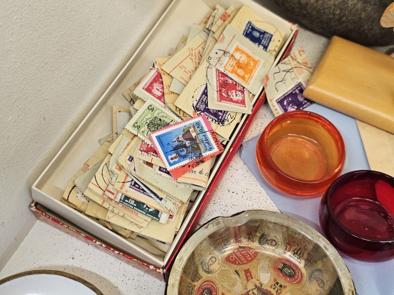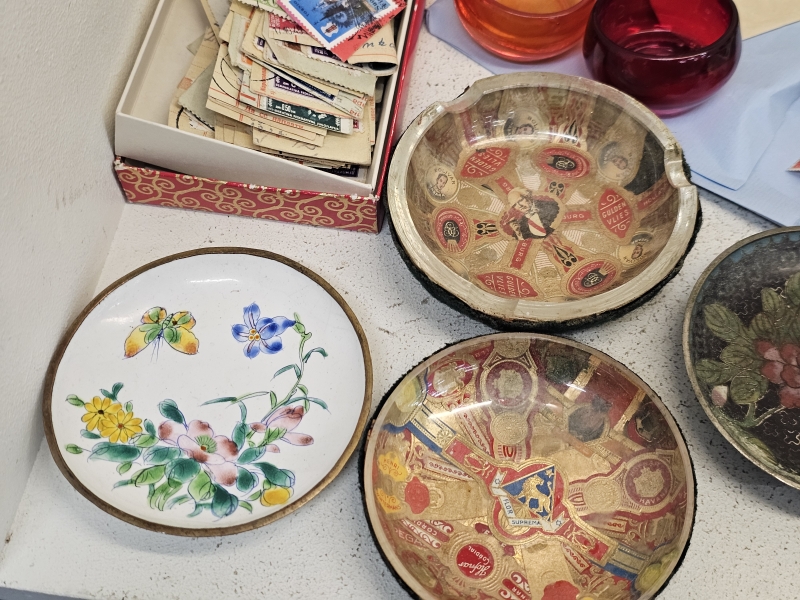 #2475 Erä keräilytavaraa: Mm. postimerkkejä, cloisonnea, Viewmaster ja kuvia, Aarikka ym.