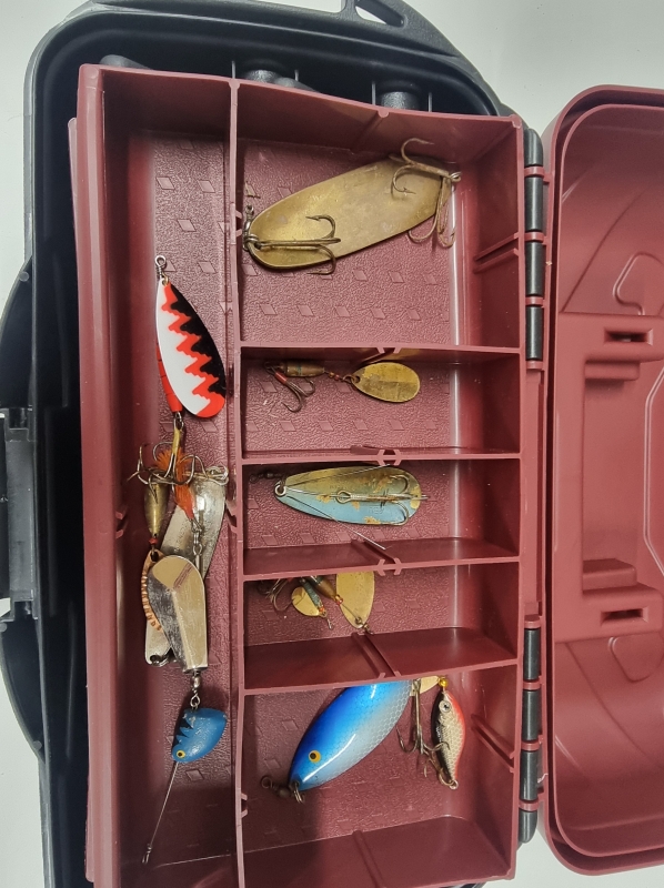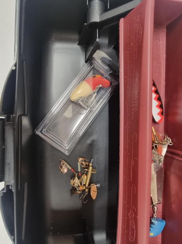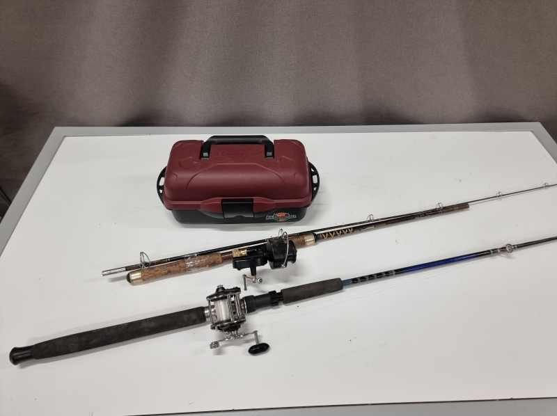 #2469 Kalastustarvikkeita, mm. 2kpl virveliä ja uistinpakki