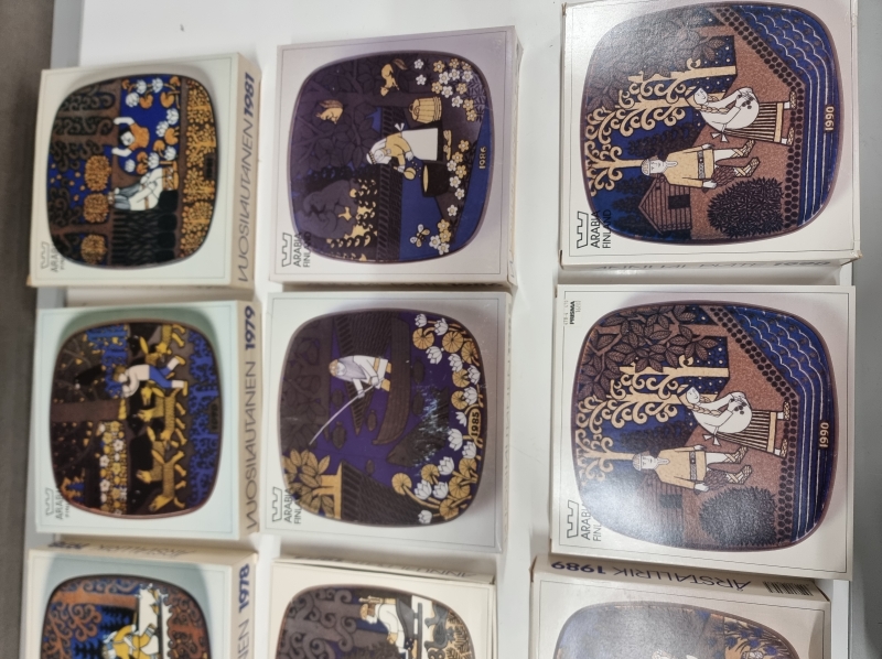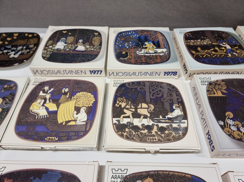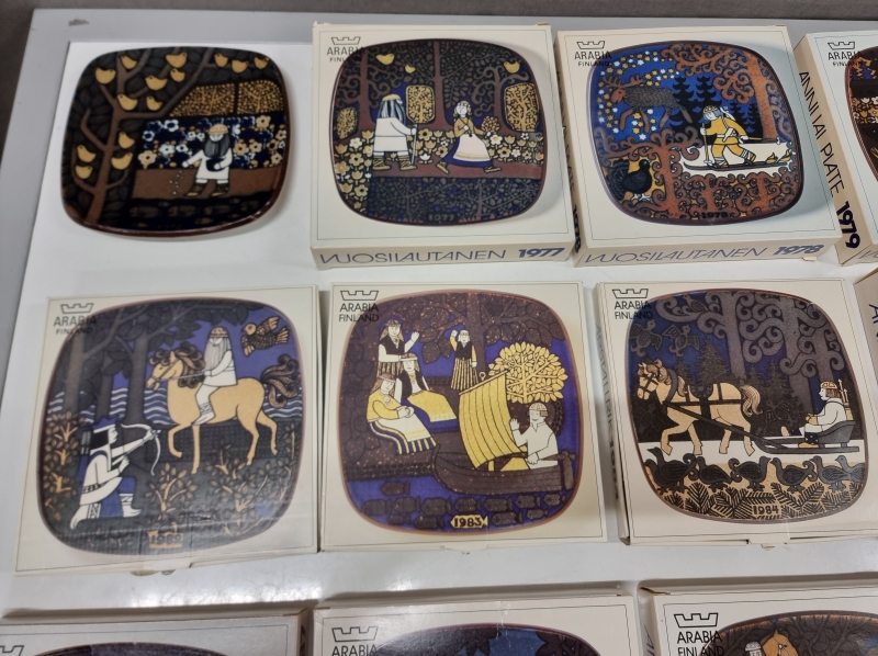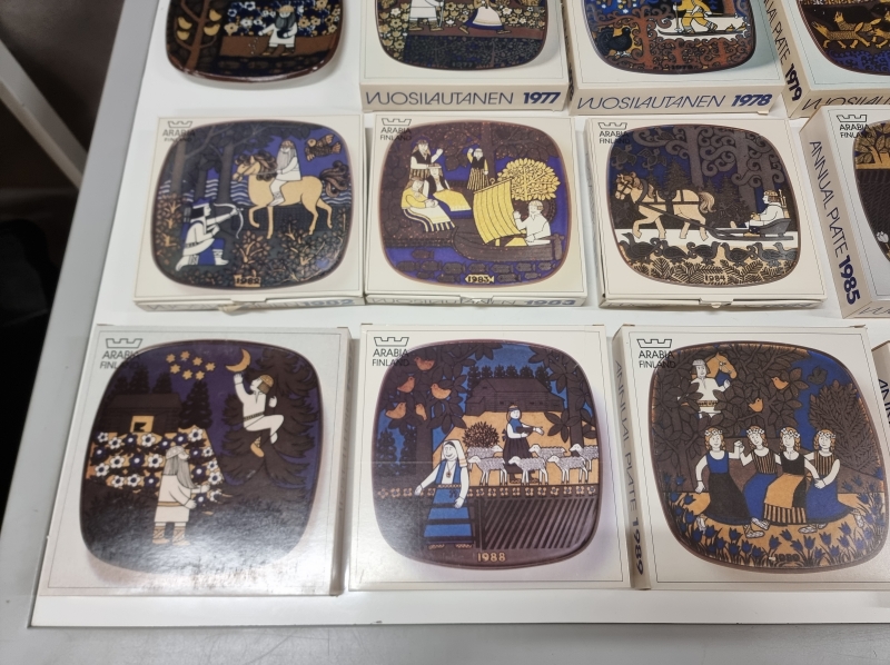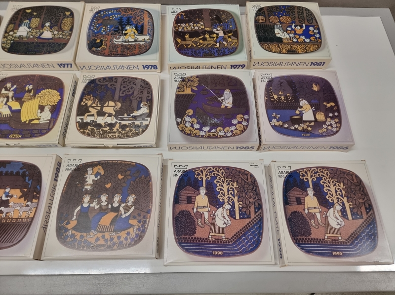 #641 Arabia, Kalevala vuosilautasia 1976-90 (ei vuoden 1980) + laatikot