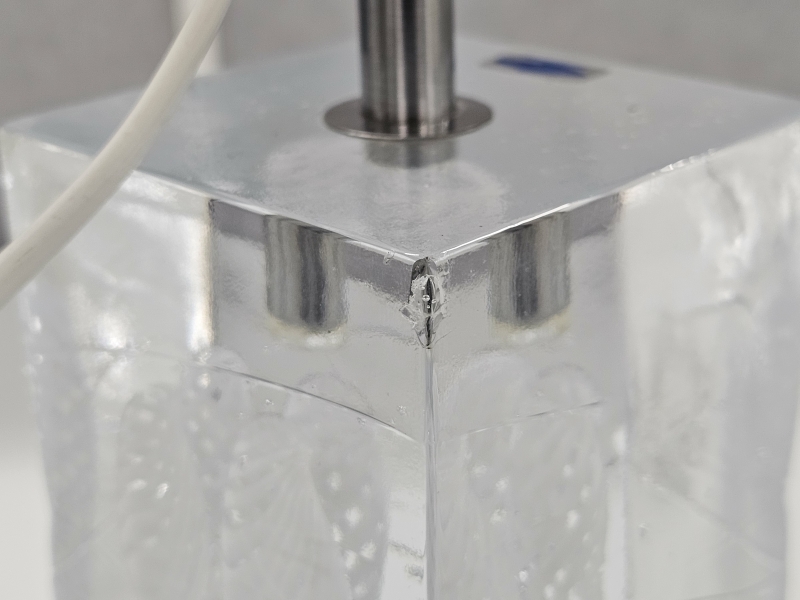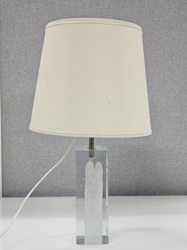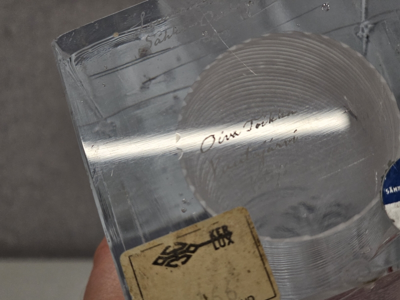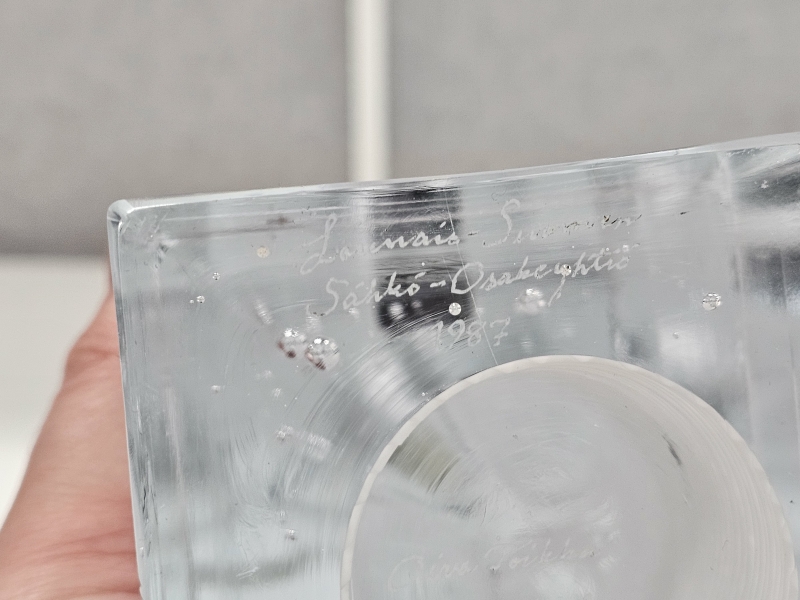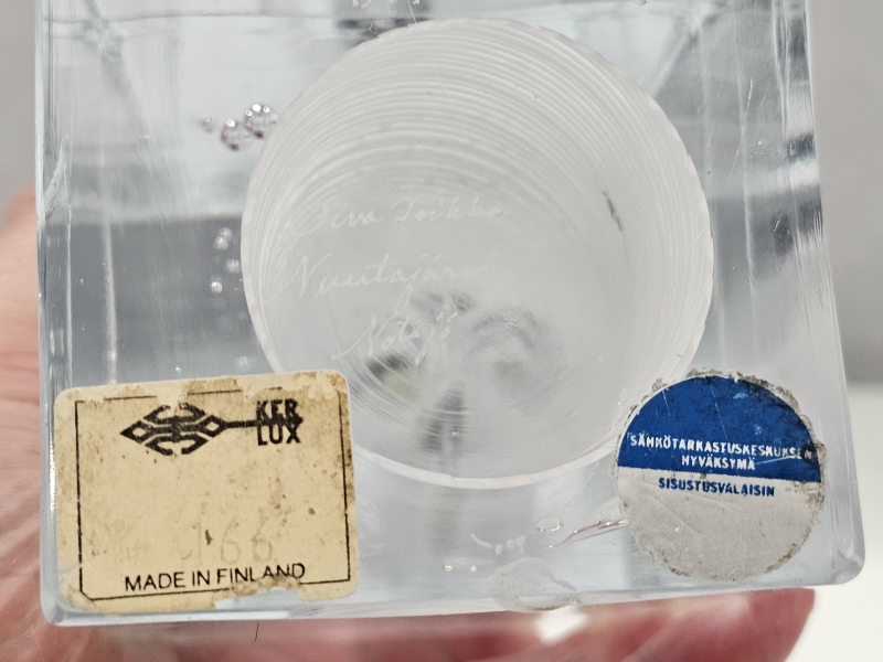 Sign. Lounais-Suomen Sähkö-Osakeyhtiö 1987. Yhdessä reunassa vika. Lasiosan k: 23cm, kokonaiskorkeus 53cm.