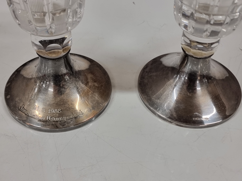#251 2kpl Aimo Okkolin kristallimaljakoita hopeajalalla.