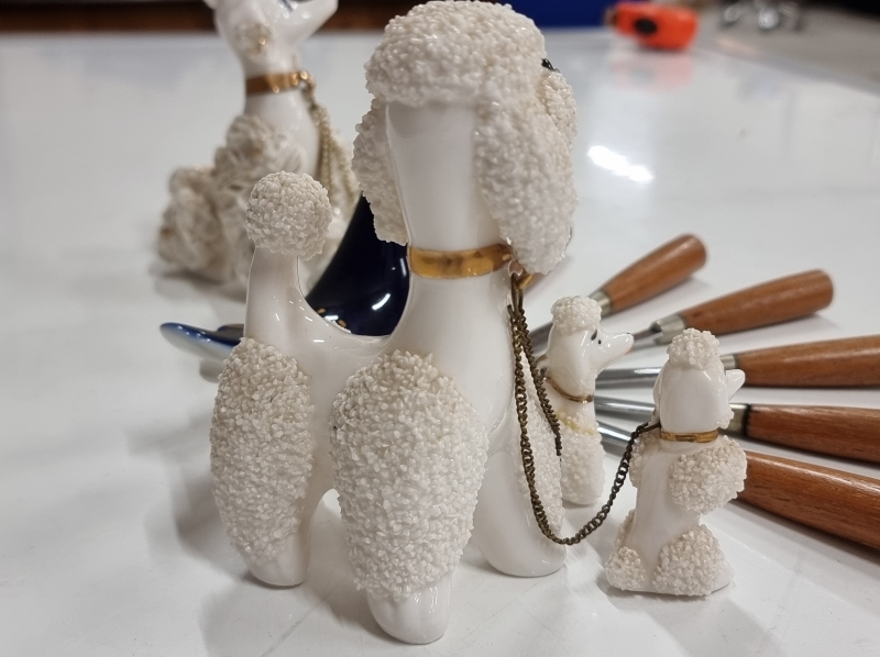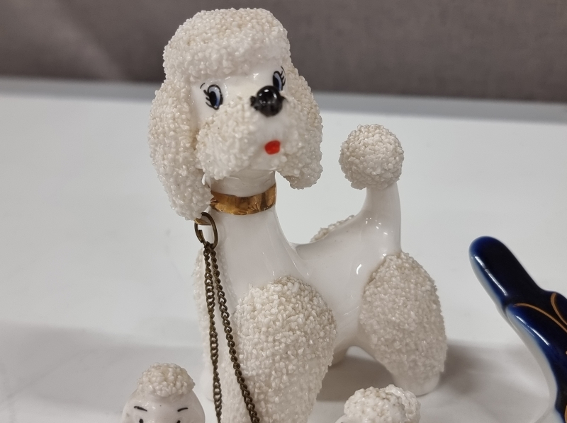 #710 2kpl koirafiguureja, Lomonosov-sirotin ja 6kpl Iisakki Järvenpää hedelmäveitsiä.
