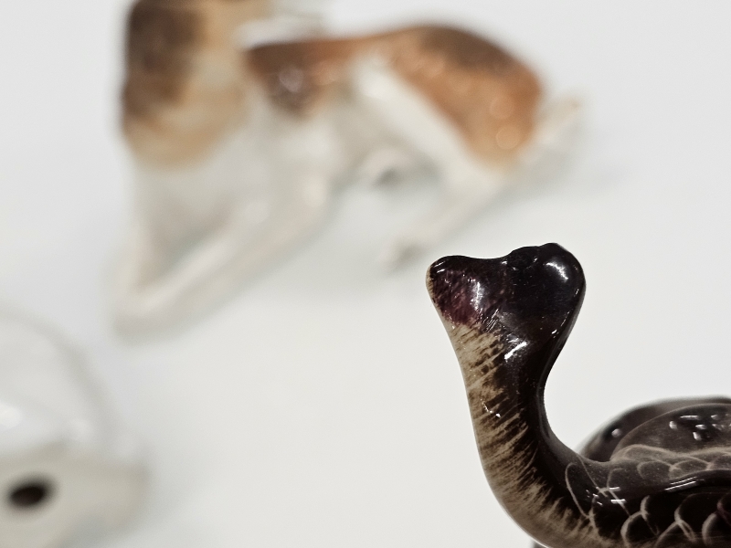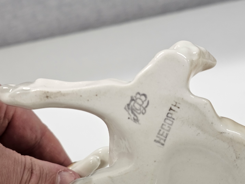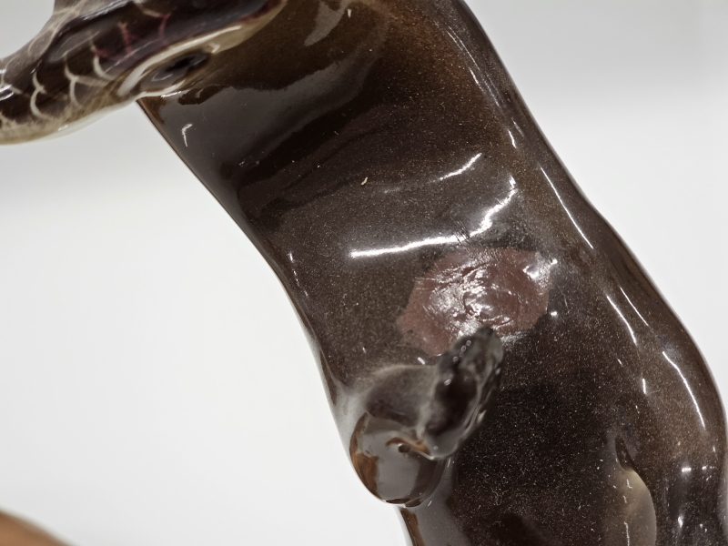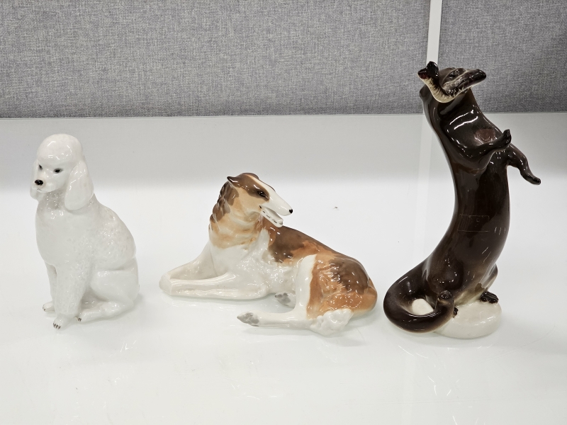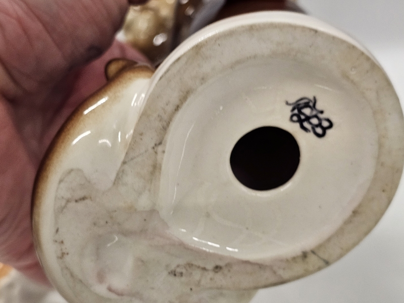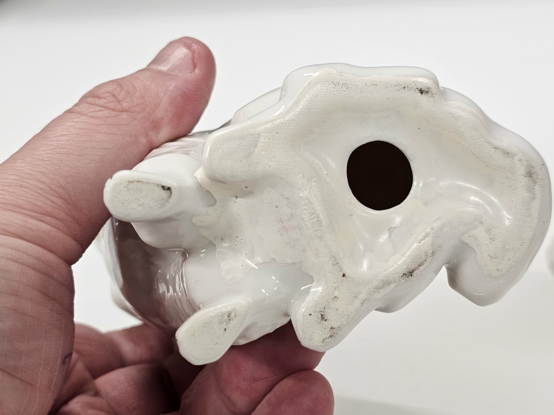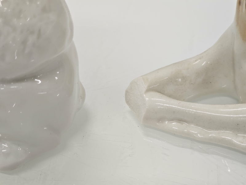 Korkein 22cm. Valkoisessa pohjassa maalia, toisen koiran tassut puuttuvat ja korkeimmassa korjausmaalauksia
