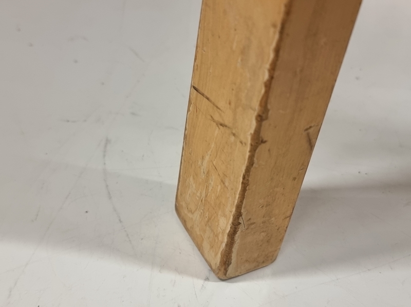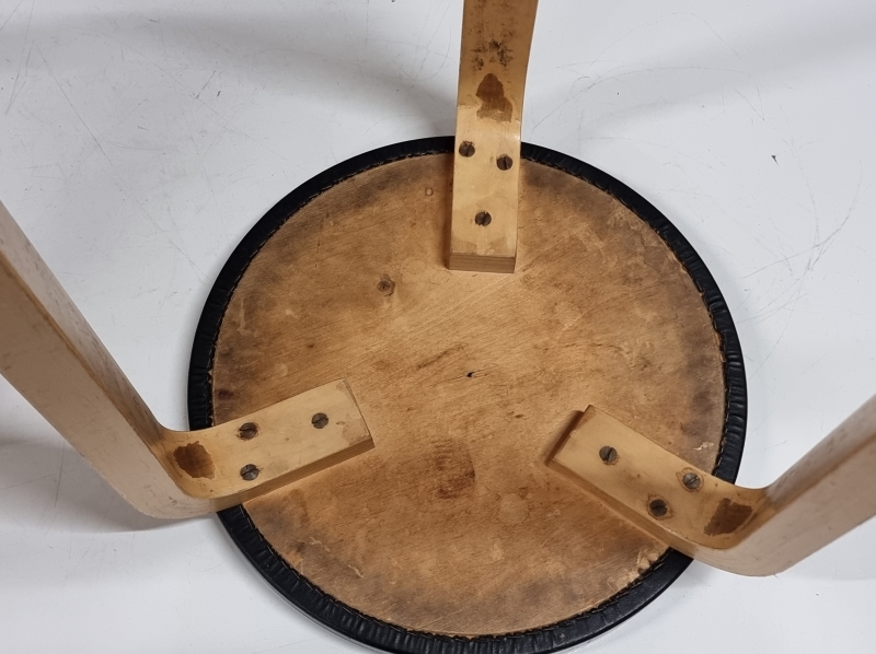 Päällyksestä pala pois ja kulumaa. Toisen jakkaran ruuveja vaihdettu. Korkeus: 43,5cm
