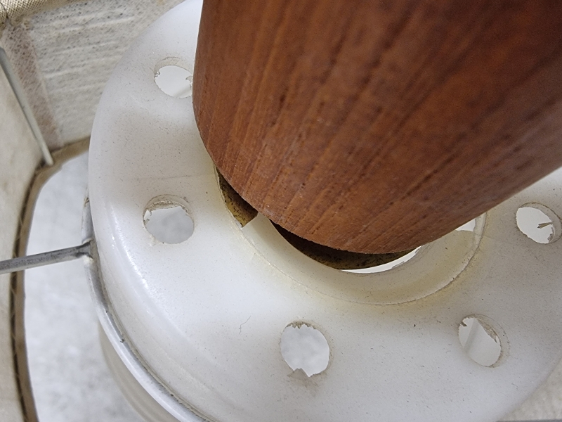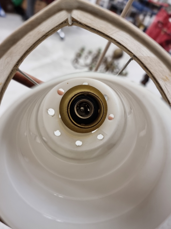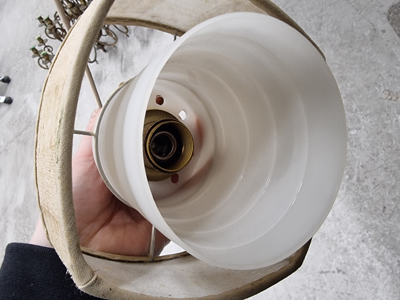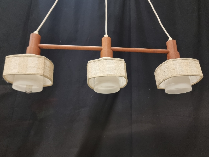 Kangasvarjostimet likaiset. Leveys: 64cm. Keskimmäinen kupu rikki