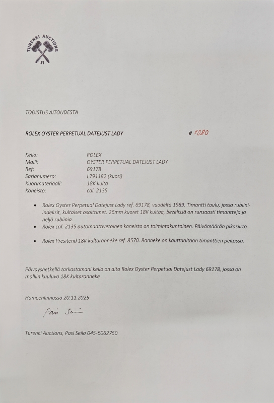 Ref: 69178. Bruttopaino 71,69g, myös ranneke kultaa. H: 26mm. Timantit jälkiasennettu. Mukana aitoustodistus