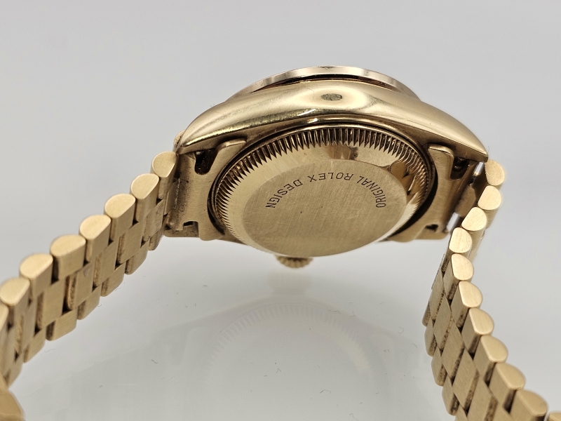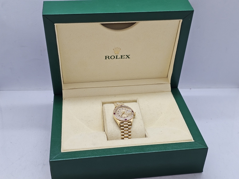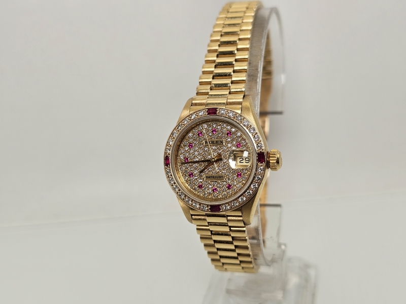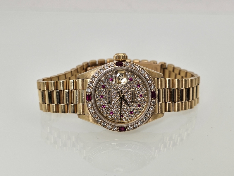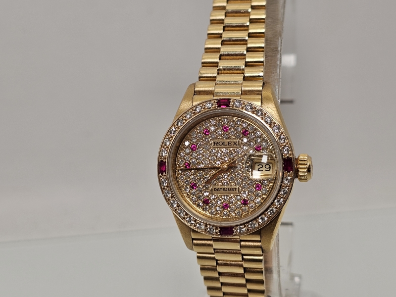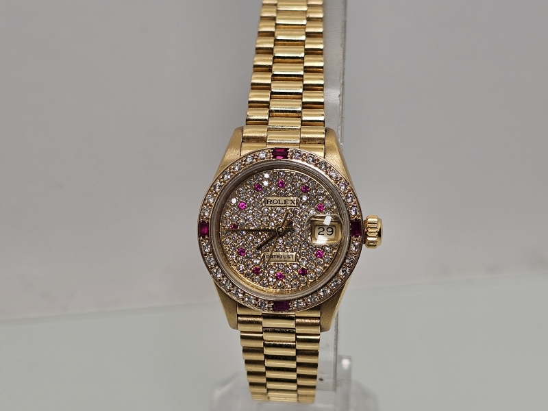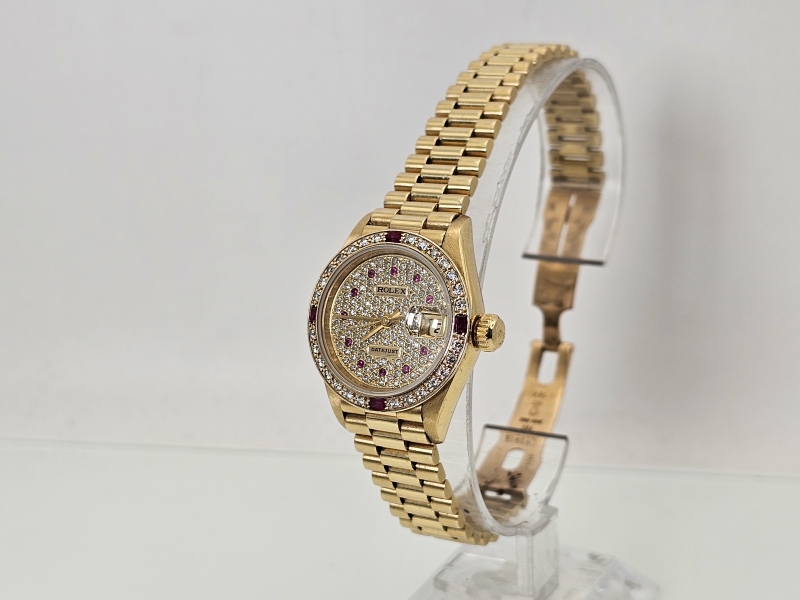 #1080 Rannekello: 18k kultainen Rolex Datejust Lady runsailla timanteilla ja rubiineilla [afterset], 71,69g