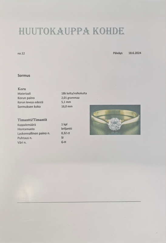 Bruttopaino 2,01g. Ei kaiverrusta. Koko 16. Mukana aitoustodistus
