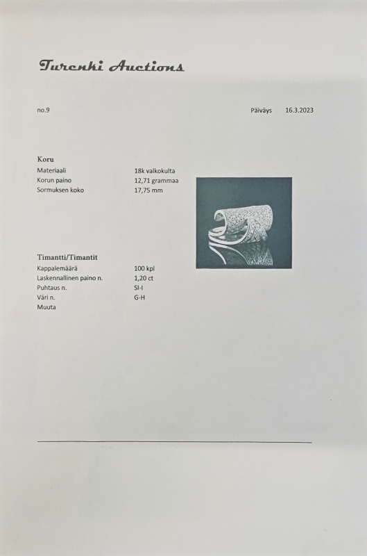 Bruttopaino 12,71g. Mukana aitoustodistus. Ei kaiverruksia. Koko 17,75