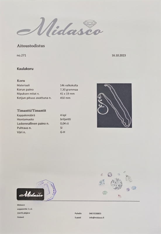 #1130 14k valkokultainen kaulakoru 4 timantilla [yhteensä n. 0,04ct], 7,3g