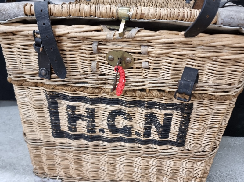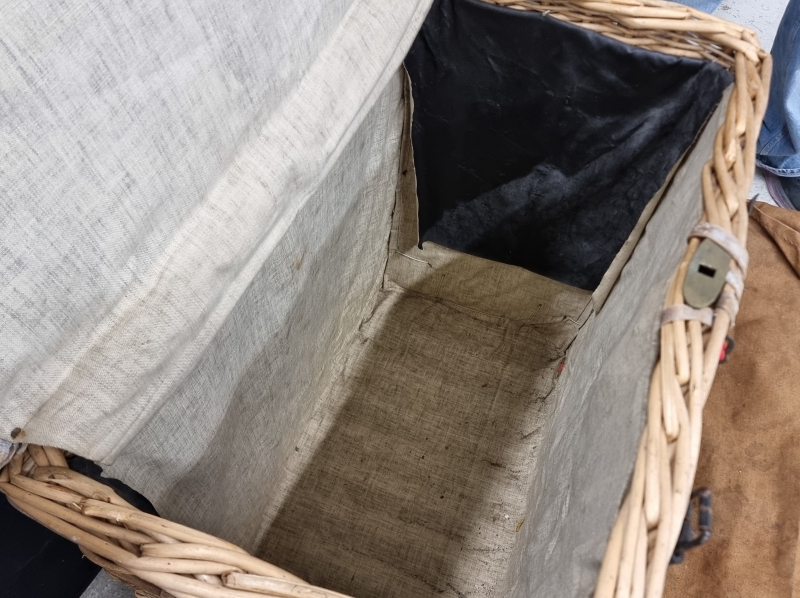 #2100 Rottinkinen lukittava vanha kuljetusarkku pyörillä + asesäkki