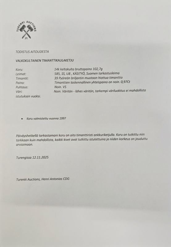 Ketjun pituus 70cm. Bruttopaino 102,7g. Mukana tutkimustodistus