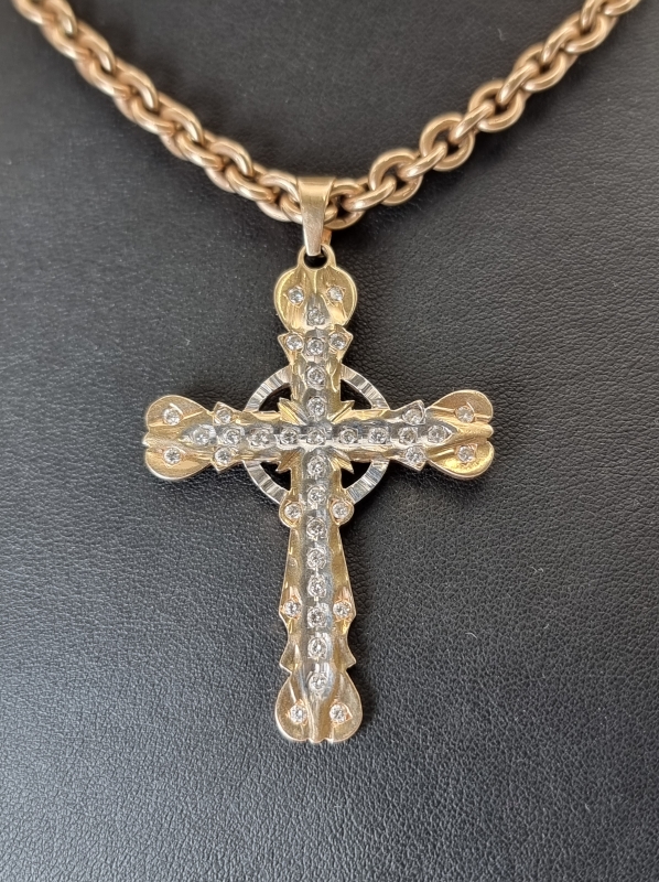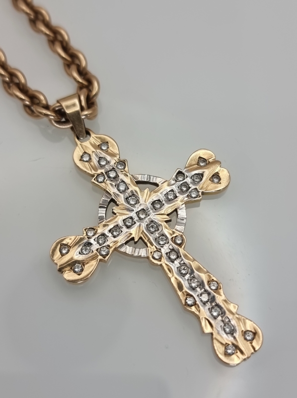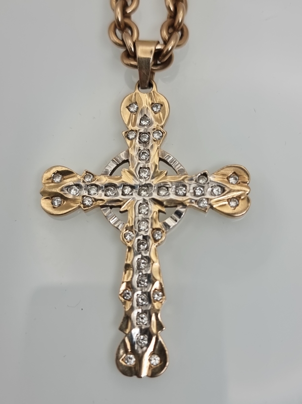 #1048 14k kultainen kaulaketju ja iso ristiriipus 39 timantilla joita yhteensä n. 0,97ct, 102,7g
