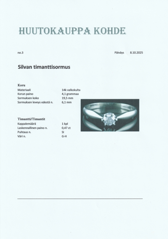 Mukana aitoustodistus sekä uusi korurasia. Koko hyvin muokattavissa ammattilaisen toimesta [ei kuulu hintaan]. Bruttopaino 4,1g. Koko 19,5
