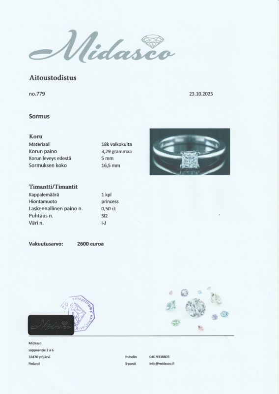 Mukana aitoustodistus sekä uusi korurasia. Bruttopaino 3,29g. Koko 16,5g. Koko hyvin muokattavissa ammattilaisen toimesta [ei kuulu hintaan]
