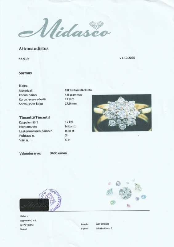 Mukana aitoustodistus sekä uusi korurasia. Koko hyvin muokattavissa ammattilaisen toimesta [ei kuulu hintaan]. Bruttopaino 4,9g. Koko 17
