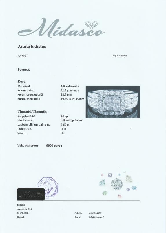 Mukana aitoustodistus sekä uusi korurasia. Koko hyvin muokattavissa ammattilaisen toimesta [ei kuulu hintaan]. Bruttopaino 9,19g. Koko 19,35
