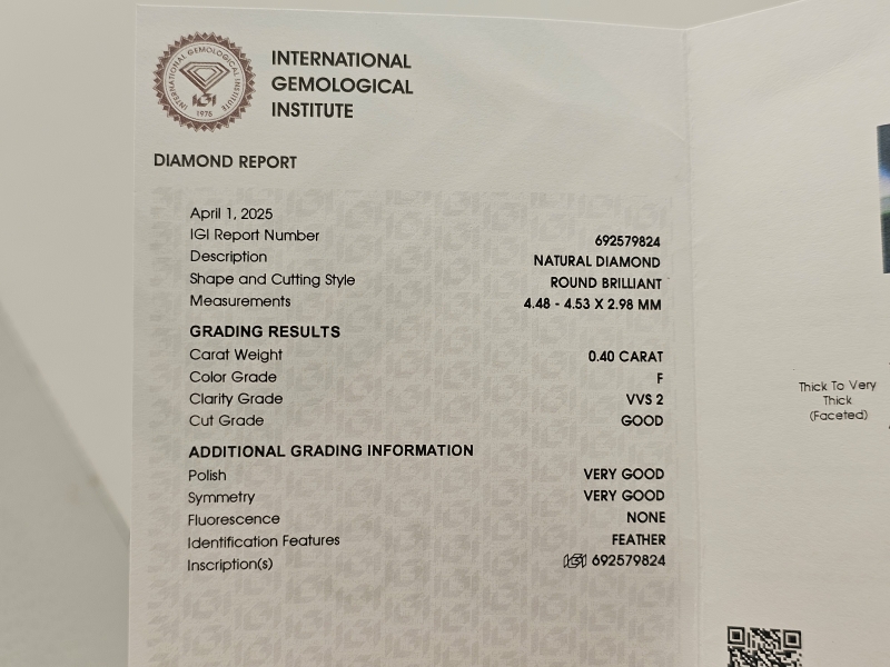 Bruttopaino 0,68g. Mukana aitoustodistukset timanteille. Timanteihin kaiverrettu sertifikointinumero