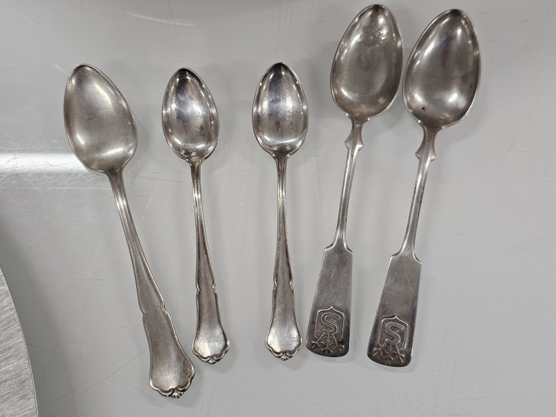#2007 Erä jossa mm. Tapio Wirkkala tinamalja, 2kpl hopeisia suojeluskunta-lusikoita ym.