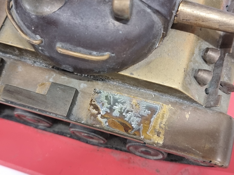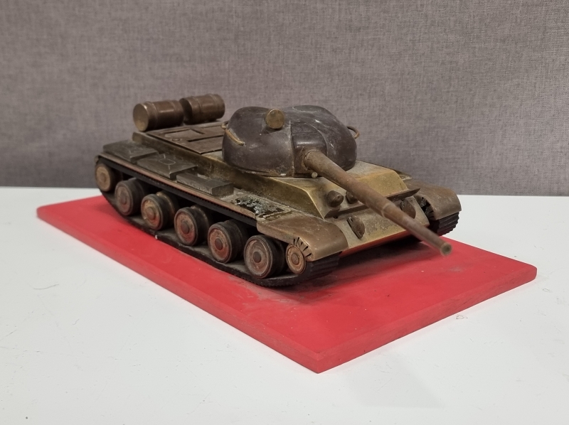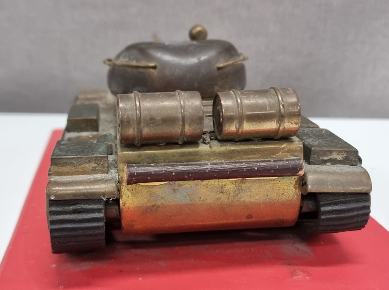 #1740 - Metallinen panssarivaunu puulevyllä. Tankin pituus 32cm.