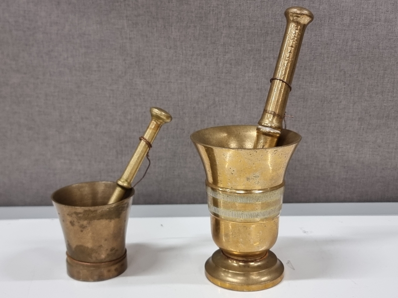 #2205 Erä vanhoja esineitä. Mm. 2kpl mortteleita ja tiinu v.1879