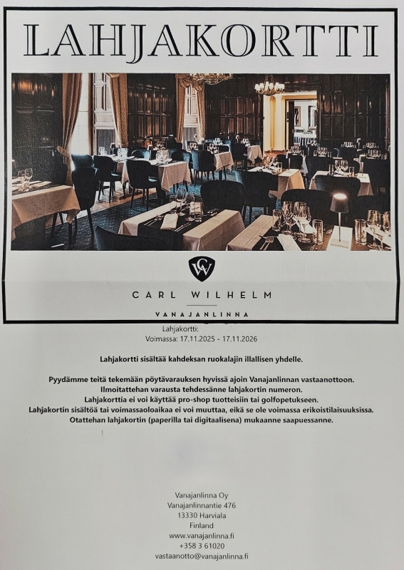 #1002 2kpl Vanajanlinna Carl Wilhelm lahjakorttia kahdeksan ruokalajin illalliselle