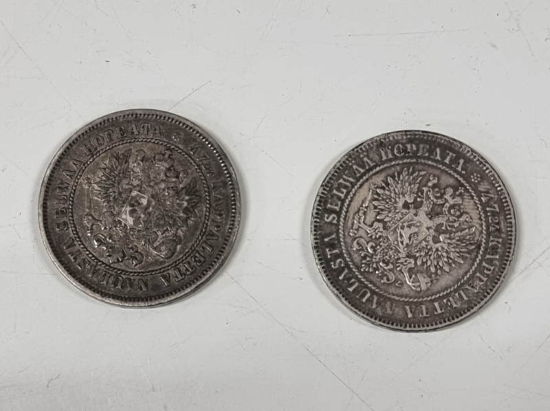 #1930 Erä suomalaisia kolikoita. Mm. 2mk 1874 ja 2mk 1872