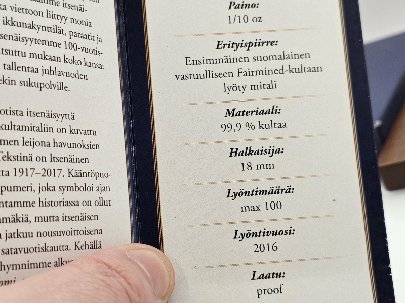 #1401 Kultakolikko: Suomi 100v juhlamitali nro. 030/100, 3,13g