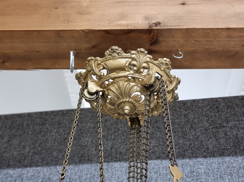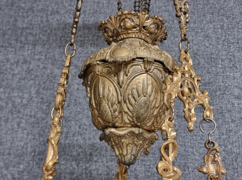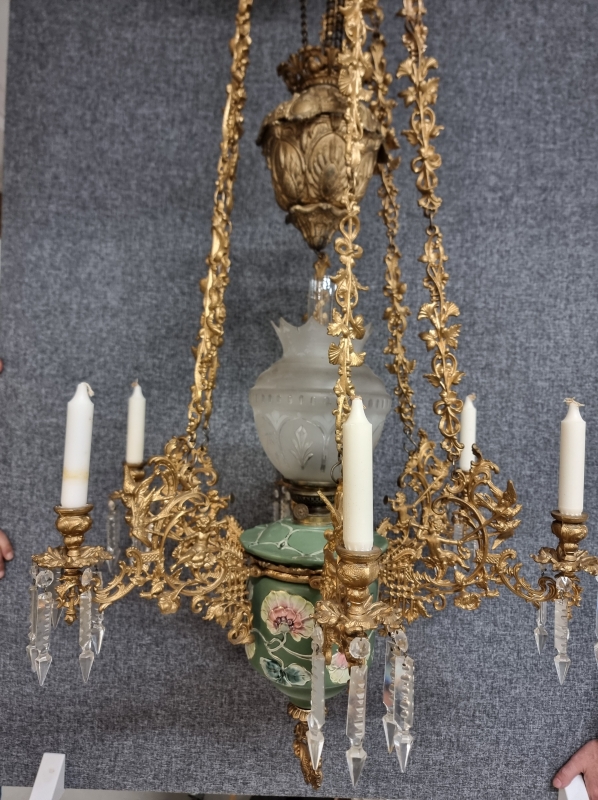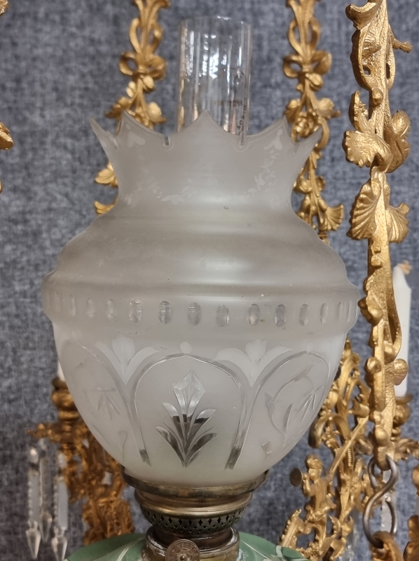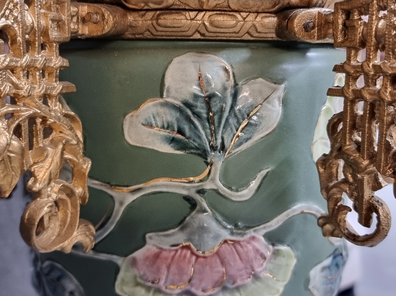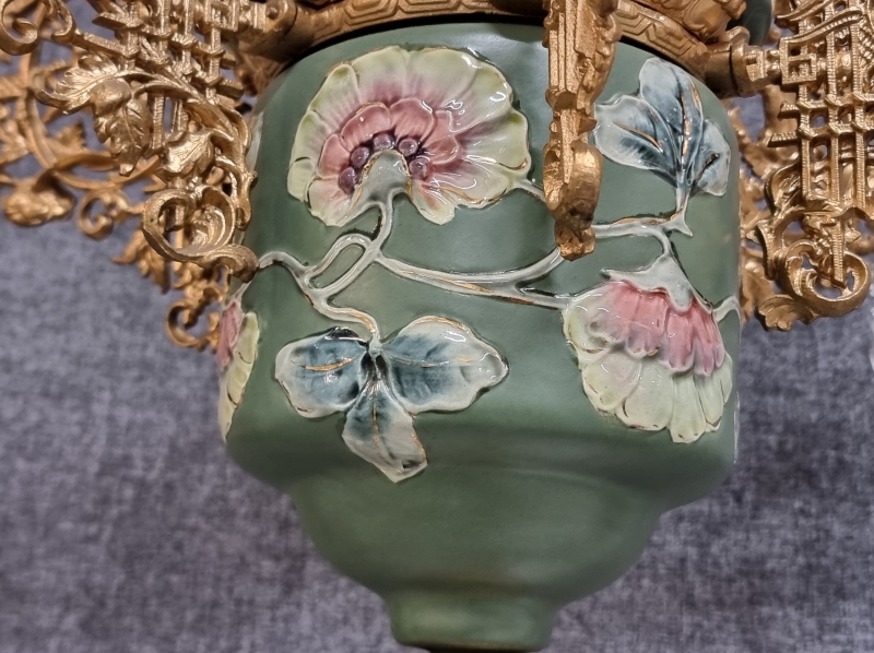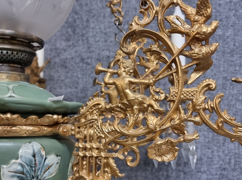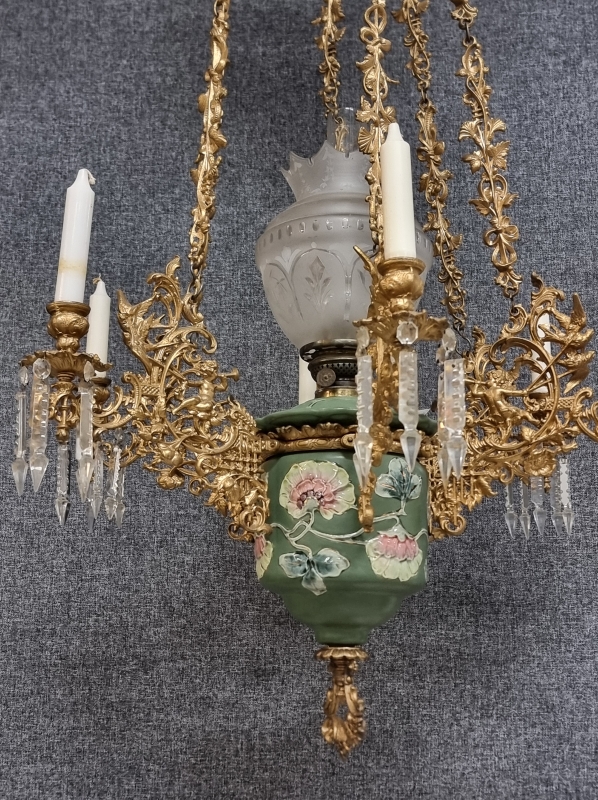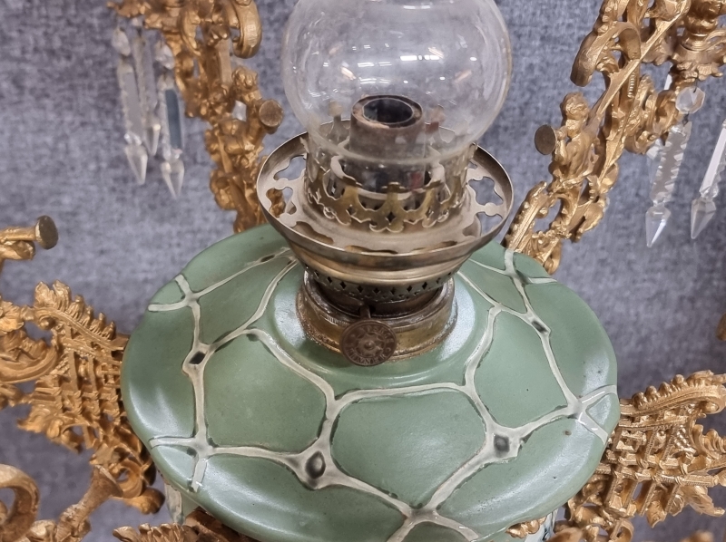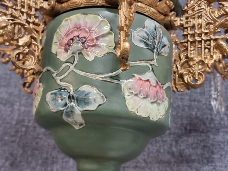 #1938 Näyttävä messinkirunkoinen öljyvalaisin majolika-säiliöllä