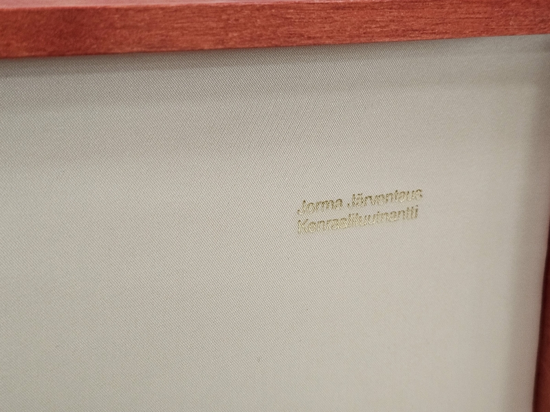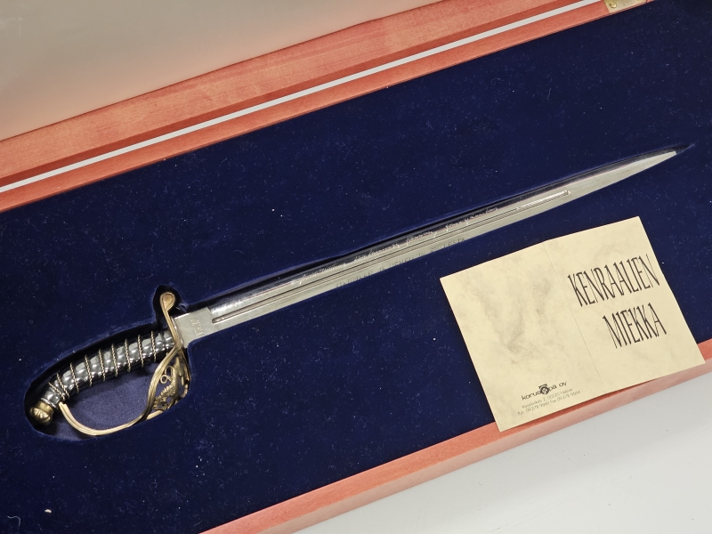 Miekassa kenraalien signeeraukset. Miekan paino 253g, pit: 40cm. Hienossa säilytysrasiassa jossa Suomi-leijonat. Nro. 30/100, valmistaja Jyrki Laisalmi