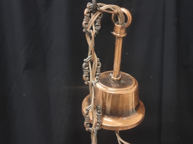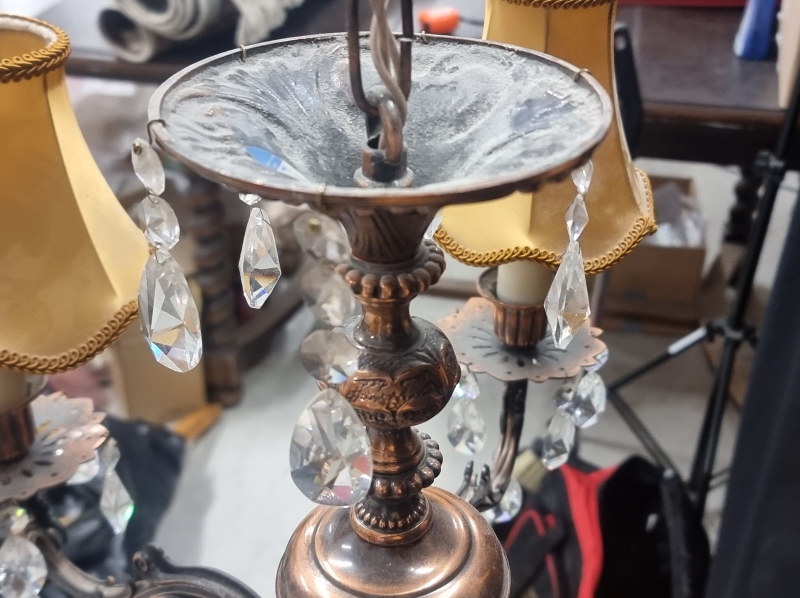 #2398 - Metallirunkoinen kattovalaisin kristalleilla ja kangasvarjostimilla.