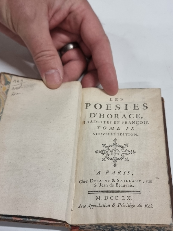 #2046 3 kpl vanhoja ranskankielisiä kirjoja: Les Poesies d'Horace1760, Principes de l'Historie Sainte 1761 ja La Legende Doree des Dieux et des Heros 1924