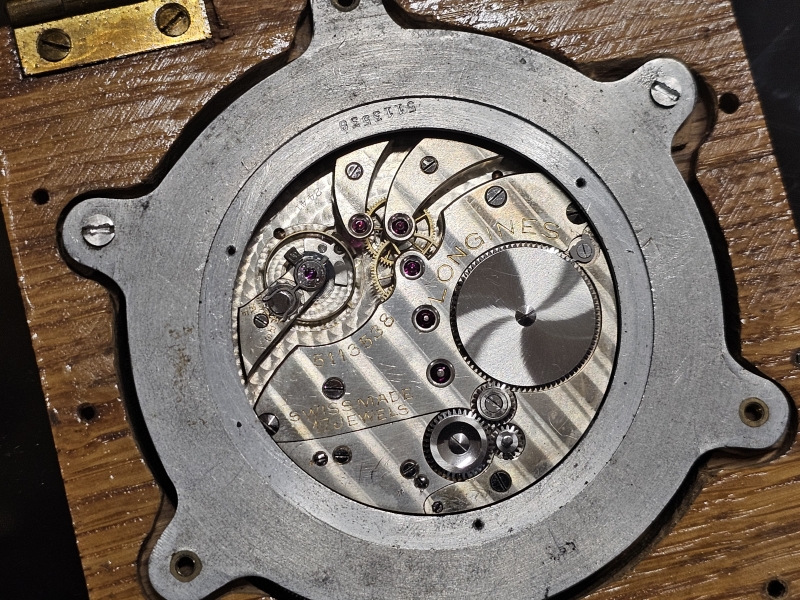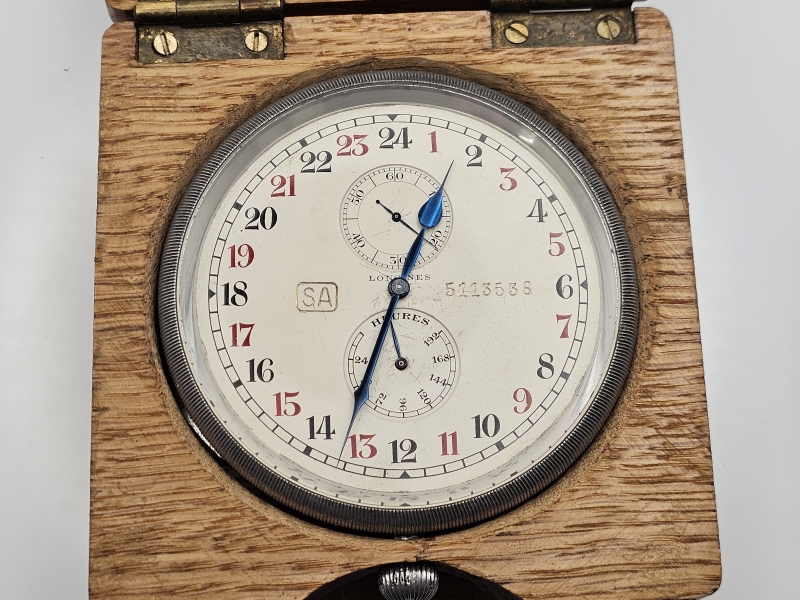 #1480 Harvinainen Longines "lentäjänkello" SA -leimalla ja 24h näytöllä, puulaatikossa, vuodelta 1932