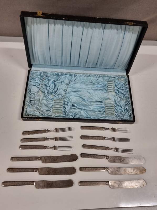 #2415 Vanhat hopeoidut aterimet laatikossa.