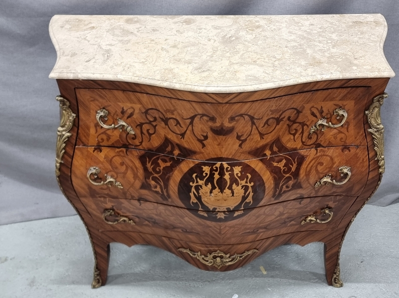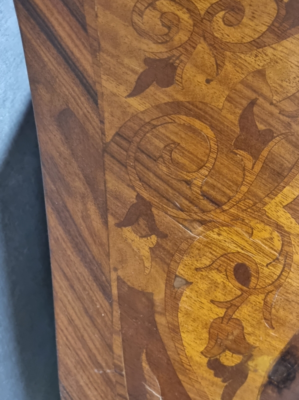 #1820 - Kivikantinen mahalipasto runsailla intarsiaupotteilla ja messinkilyötteillä.