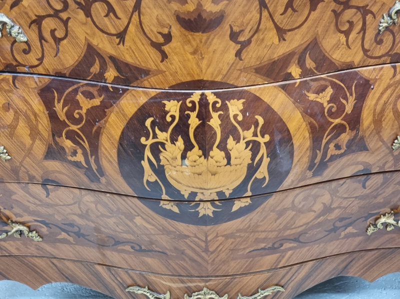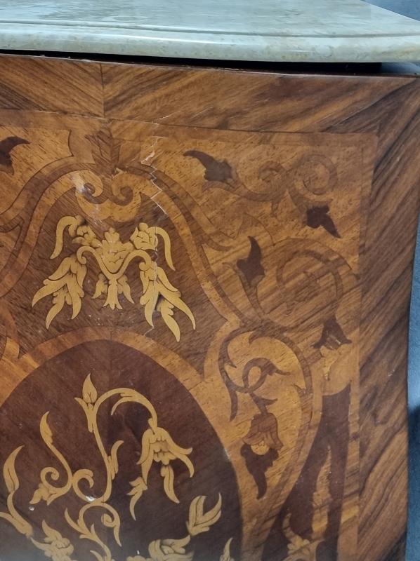#1820 Kivikantinen mahalipasto runsailla intarsiaupotteilla ja messinkilyötteillä.