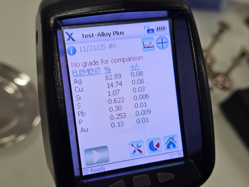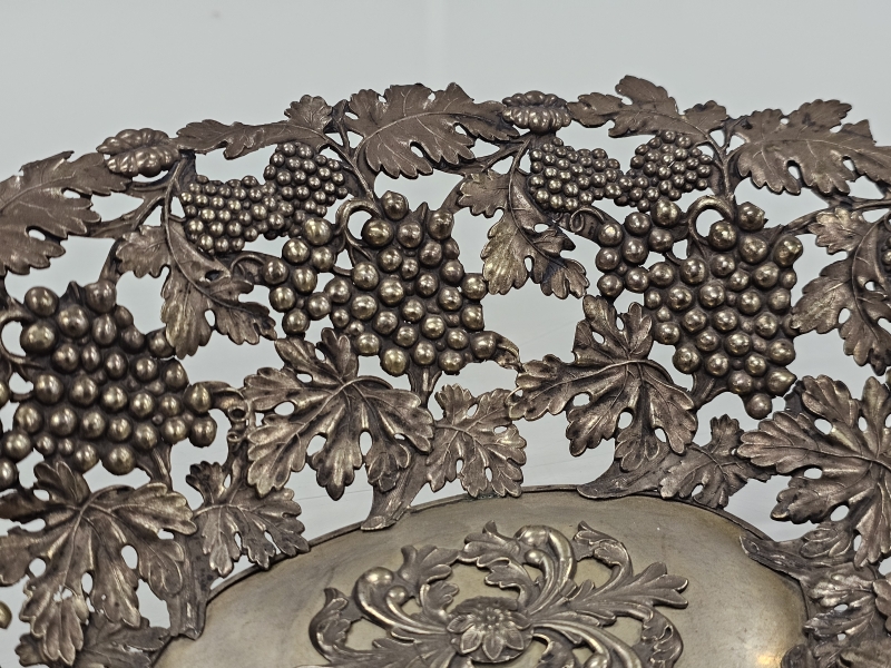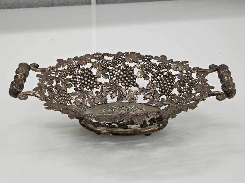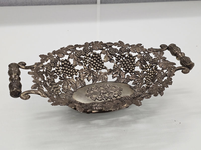Paino 395g. Epäselvät leimat, testattu XRF-laitteella noin 830/1000 hopeaksi. P: 36cm