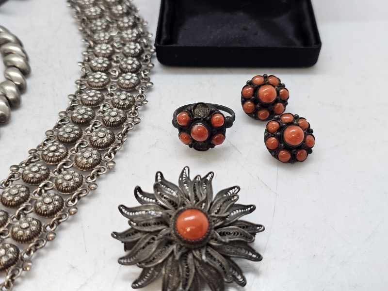 #1591 Erä hopeakoruja: Mm. niellokoristelu, camee rannekoru ym.