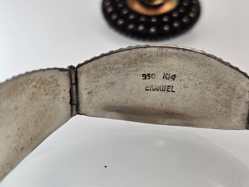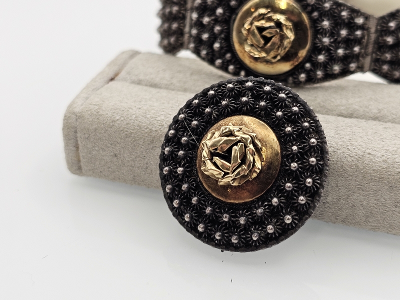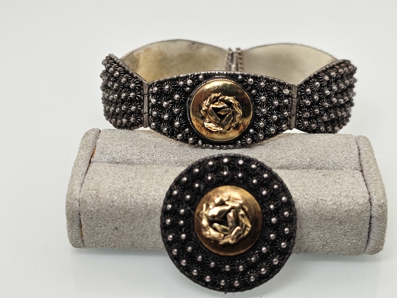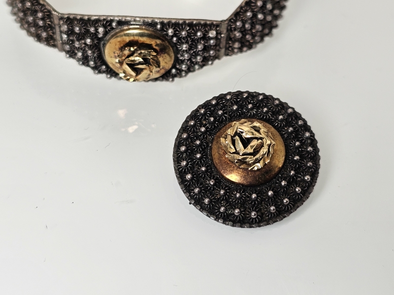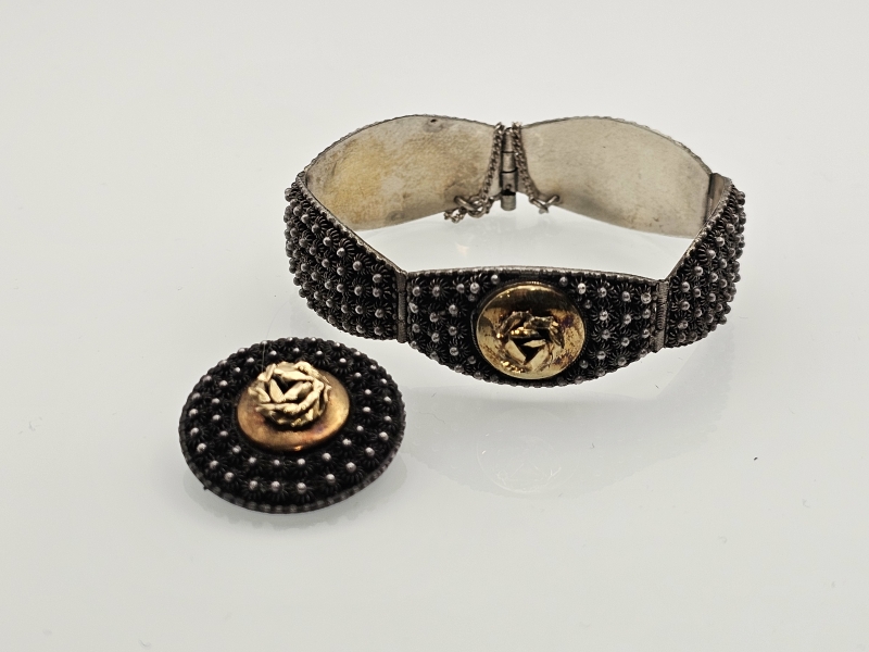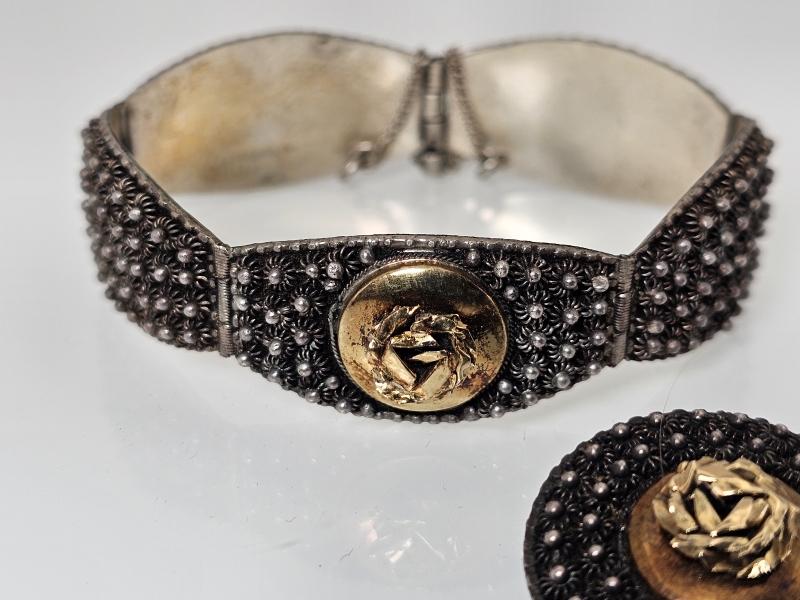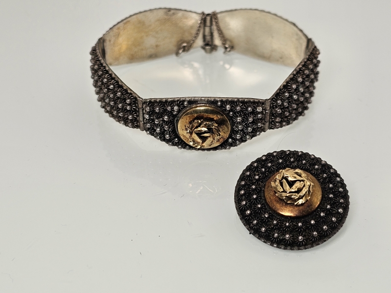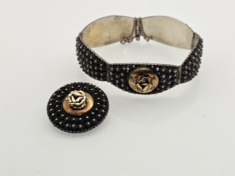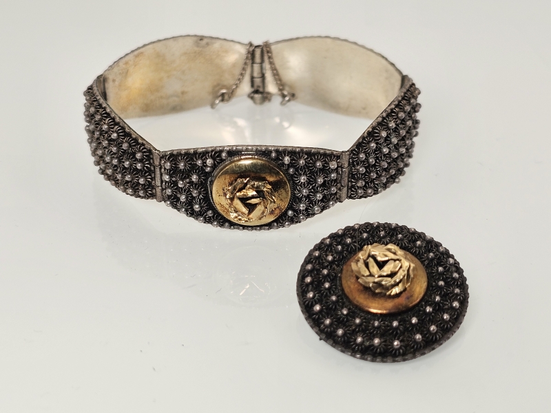 #1592 Hopeinen rannekoru & riipus / rintaneula kultaisilla koristeilla