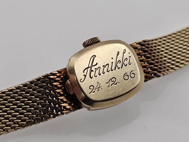 Bruttopaino 34,8g, myös ranneke kultaa [ilman koneistoa 31,5g]. L: 14,5mm