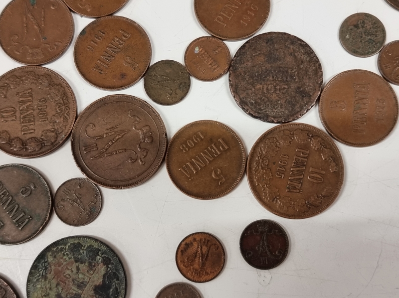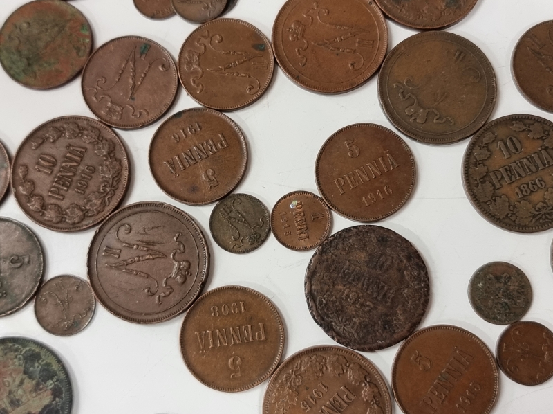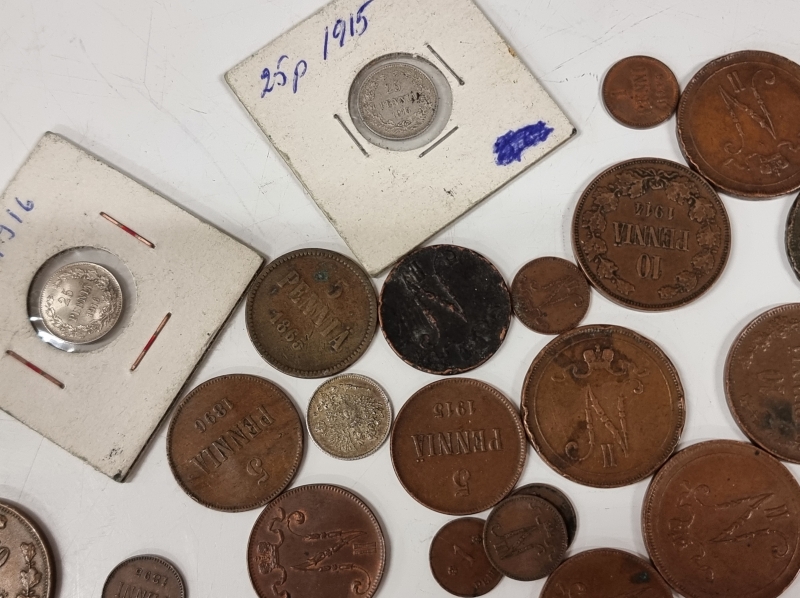 #1124 Erä vanhoja suomalaisia kupari ja hopeakolikoita: Mm. 25p 1915 ja 10 penniä 1866