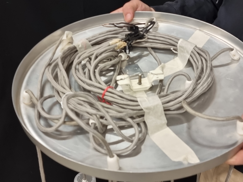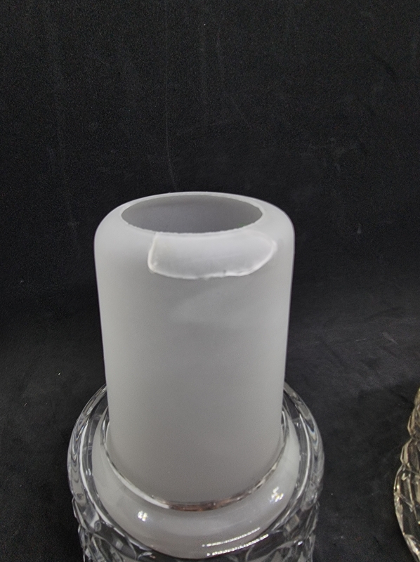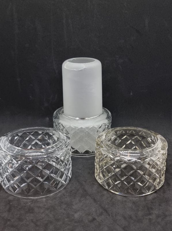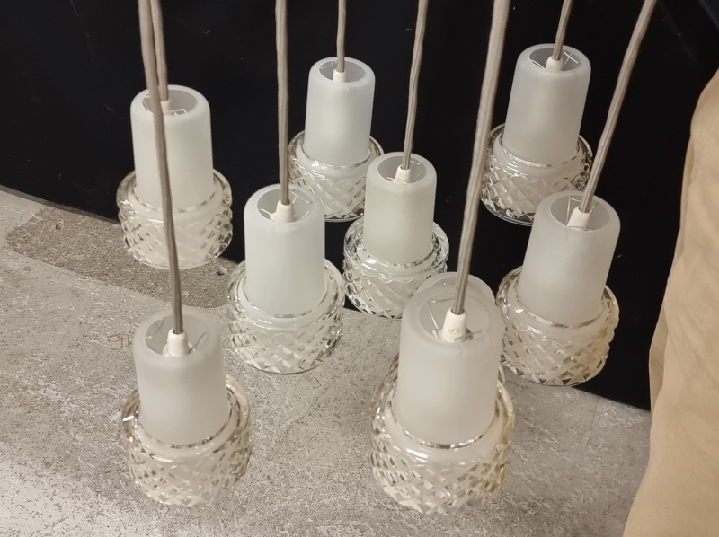 Korkeus 60cm. Kolme ylimääräistä kristallikupua ja yksi ylimääräinen opaalikupu, jossa särö